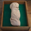 צילה שהם הניחה אובייקטים בתוך קופסאות עץ ישנות: כפות ידיים עשויים מחומר, פסלון של מלאך שבור כנף, חבל וחוטי מתכת. כל אלה מונחים, דקורים ומלופפים יחדיו ומרכיבים אובייקט חדש בעל סמליות חדשה.