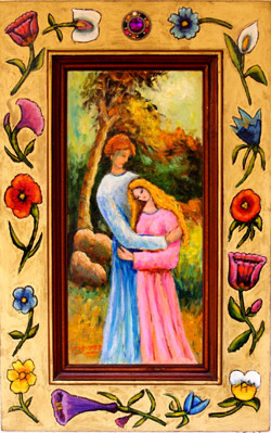 הציורים מולבשים בתוך חלקי רהיטים שהאמן אוסף בשווקים. צורות מיוחדות של רהיטים עתיקים, הוא משלב את הציור בתוך החלק של הרהיט שהוא בחר , על "המסגרות" לפעמים הוא מצייר ולפעמים הוא מצפה בתכשיטים וחרוזים. התוצאות מתקבלות בצורה מאוד מעניינת , ססגונית ועכשווית . החיבור בין הרהיט והקישוטים וציור המסגרות ותוספת התכשיטים והחרוזים לוקחים אותנו למקום אחר , לעולמו של האמן שאינו נכנע לשום איזמים למיניהם , מעניינת דרך התפתחותו מהתערוכות הקודמות הוא עקבי ועקשן ,בתערוכתו "זכרונות מארם צובא" הוא גם אז השתמש בחלקי ריהוט ובתערוכת היודאיקה השתמש בציורי פרחים וזהב , עתה בתערוכה הנוכחית הוא משלב את הפרחים והזהב על ה"מסגרות" הנוכחיות שהולכות בד בבד עם דמיונו המופלג ששחה בין סיפורי התנ"ך ודלה מהם אך ורק את הרגישים והיפים כפי שהוא ראה אותם בעיני רוחו . אין ספק שאלה עבודות מיוחדות שאי אפשר לשייך אותם לשום זרם ורק צריך להתבונן בהם וליהנות מעושר דמיונו וצבעוניותו של האמן.