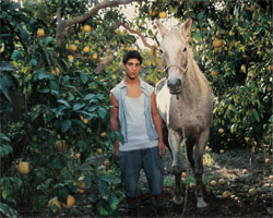 וגם הפעם, הפורמט הגדול בו מוצגים תצלומיו, מעצים את התחושות ולא מאפשר למתבונן בהם ליהנות מעצי הדר עמוסי פירות ומשדות מוריקים מתחת לשמים כחולים. כי בין עצי ההדר נראה נער שנדמה כמתחבא מפני האנשים שמזכירים לו עד כמה אינו שייך למקום בו הוא נמצא ושבו הוא חי ועובד, ובשדות המוריקים מתחת לשמים הכחולים יורים ברובים ובאקדחים.