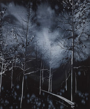 יערות הקרן הקיימת הם למעשה חורשות שנשתלו על ידי בני אדם בניסיון להשתלט על הטבע בארץ של הרים קירחים במזרח התיכון. אותם בני אדם גם שורפים עצים ששרדו בפגעי מזג האוויר. שאלתיאל מיטיב לתאר את העץ האחד, את האוד שניצל, את הענף שנותר, את העלה החצוף העומדים מול שממה שחורה כמו לועגים להרס של בני האדם. הפחם, הזפת, צבע השמן המונוכרומטי והלכות השקופות על גבי בדי ענק הם החומרים הטבעיים שמשתמש בהם שאלתיאל ומדייק בהם את תחושותיו: הנה הוא היער השרוף שתיכף יקרום עלווה, דשא, פטריות, חיות קטנות וחמצן.