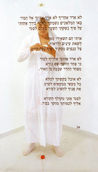 יד צובעת, כותבת, מדגישה, מכסה בצבע, וחוזר חלילה עד אין סוף. הציפורן האחוזה ביד סופר-סתם שטבל לטהרתו במקווה, הומרה בעיפרון, מברשת וצבעי גוף, ובעיקר – ביד אישה. פתח גוף האישה המסמל בדימומו חזרתיות אינסופית של "זמן נשים" (כפי שתיארה את הדברים קריסטבה, כאמור), בחירת המילים החיוביות מתוך הטקסט בהשמטה של ההתניות, והניסיון לאיחוי ותיקון על ידי סימון התחושות והמחשבות, הם לדברי האמנית "ניסיון להחזיק בחוויה המתמשכת של הישרדות לצד תחושת אשמה". הפעולה של השמטת ההתניות שבטקסט המקראי מתריסה ביחס לדימוי האל, הפטריארך המקראי, ומזכירה את קריאתה של התיאורטיקנית שרה רודיק, מעמודי התווך של ההגות הפמיניסטית, שהציעה לחשוב ולהתייחס זה אל זה כאל סובייקטים חופשיים הזקוקים לטיפול ולא לפיקוח.