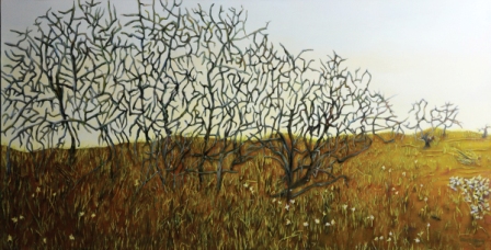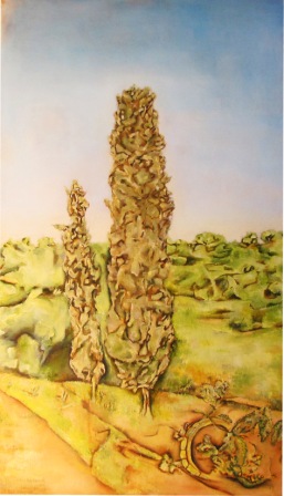 רחוב בן יהודה והצינה קורעת את העצמות. מאיץ את צעדי ונשטף במחשבות שליוו את המטרים האחרים לפני בואי לגלריית ברנרד. שמה של התערוכה "הדרך" כשברקע עוד כמה שעות מסתיים לוח השנה של בני שבט המאיה ועל פי הנבואה מגיע העולם אל קיצו. כל אלו יחד מזכירים לי את ספרו "הדרך" של הסופר היפני קורמק מקארתי. אב ובנו במסע עוכר שלווה באמריקה שאחרי אפוקליפסה. חמימות עוטפת אותך באינטימיות בתוך רחש האנשים בגלריה. "תחושה של עצירת הזמן בעולם מלא חרדות, שנאה והרס, נוף מגוון של עצי ברוש וזרועותיו הקוצניות של צמח הצבר נטועים על אדמתו המשתרעת על פני הרריות גולשת" (פתח דבר - דויד בוסקוביץ)