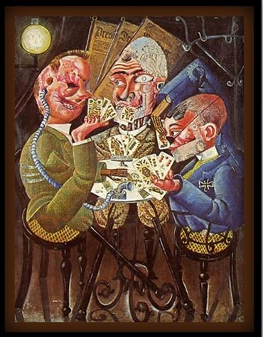 בציור הריאליסטי-גרוטסקי עז המבע 'משְחק הקלפים של נכי המלחמה' (1920), דיקס מציג נכי מלחמה קרחים וקטועי גפיים יושבים בבית קפה עירוני, שברקע עיתונים דאדאיסטים. החייל משחק באמצעות אצבעות כף רגלו, אחר מחזיק את הקלפים בשפתיו והשלישי, עם הרטייה בעינו, המניע את ידו האחת באמצעות מנגנון מכני, נושא אות גבורה על דש מעילו הכחול.הדמויות המעוותות בצורה מופרזת, בקווים ברורים, נמרצים, בצבעים עזים וזוהרים, בציור שנושא אופי סאטירי-סרקסטי ובהצגה של דמויות מורבידיות, דוחות ודה-הומניות, מבטאות עיוות וחולי חברתי, חוויות אימה מפחידות של ניפוץ האשליה, ההתפכחות מהמלחמה, ההכזבה מימנה והייאוש שבא לאחריה.