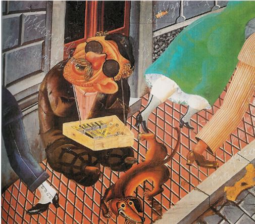 הציור נועד גם לגנות את הצביעות החברתית של רפובליקת ויימאר שבעיני האמנים הצעירים הללו – סוציאליסטים קיצונים בעלי נטייה זו או אחרת או חברי המפלגה הקומוניסטית – הייתה גם היא לא אחר מאשר מוטציה פוליטית, תוצר של המלחמה, המפגינה את סימניה השטחיים של הדמוקרטיה, שבפועל מותירה את הכוח הממשי בידי הקפיטליסט, השוטר והקצין הפרוסי. בציורים 'מוכר הגפרורים' . ו'רח' פרָגֶה שטְרָסֶה (Pragerstrasse)', שניהם מ- 1920 כמו ציורים רבים אחרים, המוקדשים לציור בני אדם, לתיאור קמצנותם, חמדנותם, אלימותם וסבלם, דיקס מציג את הקיטוע של הגוף האנושי בזיקה לקיטוע של הזמן והמרחב הציבורי: חייל גרמני קטוע רגליים יושב על המדרכה ומוכר לפרנסתו גפרורים. לפניו חולפות-מרחפות דמויות חתוכות שטוחות ואדישות בלבוש אופנתי, בני המעמד הקפיטליסטי והצבאי, שממהרות או 'נסות' על נפשן, משני צידיי המרחב הקומפוזיציוני של התמונה המאורגנת כפרספקטיבה מעוותת.