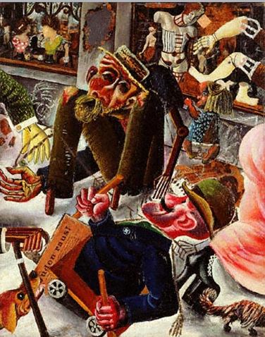 בציור 'רח' פרָגֶה שטְרָסֶה' , מוצגים שני חלונות ראווה. הימני מציג בובות כתחליף לאנשים, מחוכים לצד ידיים ורגליים תותבות.שהרי בשנת 1916 אגודת המהנדסים הגרמנית ערכה תחרות לעיצובן של זרועות תותבות. בסוף המלחמה, כעשרים דגמים של ידיים תותבות וכחמישים דגמים של רגליים תותבות יוצרו ונמכרו בגרמניה. בחלון משמאל, אנו מציצים ל'חלון הזונות'. מוצר לוואי לתקופה של הרס המוסר והערכים, עליהם ביקשו חברי הקבוצה 'להעיד'. במרכז הקומפוזיציה המתוכננת ומובנת בהשפעת הצילום, המאפשר לבודד פרטים, לקטוע אותם מהרצף, להגדילם או להאירם באור שונה, מקבץ נדבות נכה גורר עצמו על קביו. האיש שבתחתית התמונה נראה גם הוא גורר עצמו על עגלת נכים שמודבקת עליה פיסת עיתון שכותרתה 'יהודים החוצה'. הציור מציג תערובת כאוטית שלא מאפשרת לזהות בין חלקים אורגניים למכנים, בין בשר לתותב ובין מרכז לשוליים – תמונת עולם דאדאיסטית על כל הבלבול והערבוביה שבה,התואמת על פי המחשבה של בנימין את השפה האלגורית של הטרגדיה הבארוקית, המסמנת את מצב ההתמוטטות של מסורת העולם כמערכת מתוקנת ומסודרת, החושפת מציאות סדוקה, מתפוררת לקרעים ולקטעים שסופרי הבארוק ראו בה כערימת גרוטאות. 'האלגוריות', כותב בנימין 'מגלמות בתחום המחשבות את מה שההריסות מגלמות בתחום העצמים' (מוזס 2003: 14).