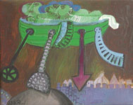 הציור "עלייה לירושלים", שמן על עץ, מתאר את בית המקדש כסמל לעיר אליה עולים לרגל. מעל למקדש מרחפים כלי טיס שונים ומשונים, שגם הם מגיעים אל העיר כעל מרבד קסמים. ממש מעל למבנה, בתוך ענן, מתואר משה רבנו מחזיק את לוחות הברית ומולו דוד בן-גוריון. השניים מושיטים את ידם זה לזה כמעין חזון הנמשך לאורך כל הדורות – החל מדור המדבר ועד הקמת מדינת ישראל. ניתן לראות בתיאור מחווה לעבודתו המפורסמת של מיכאלאנג'לו "בריאת האדם" בקפלה הסיסטינית שבוותיקן.