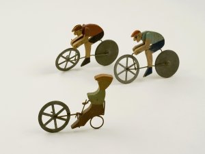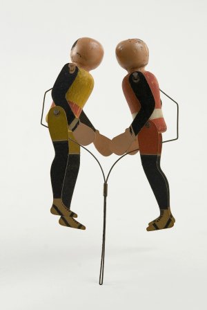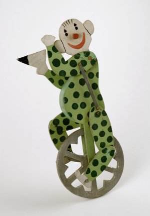 בין המוצגים בתערוכה: צעצועים קטנים המתקדמים בעצמם:"כושי צועד", עץ, בריטניה המאה ה-19,"פרש רוכב על ברווז", פח, צרפת שנות ה-30, "ירקן ודוכנו הכחול", בריטניה, שנות ה-50. צעצועים נעים על חוט: במאה ה-18 וה-19 היו מנגנונים אלה נפוצים מאוד בירידים אצל רוכלים: "תוכי מניע את זנבו"" מכסיקו סוף המאה ה-20,"דב רוסי" רוסיה המאה ה-19, "המתעמל" צרפת, סוף המאה ה-18.צעצועי קפיץ: "נחש", עץ וחוט ברזל. ארה"ב 1900, "תרנגולת בלול" גרמניה 1930, "כלב על קפיץ", הודו, 1960. מריונטות: "חזיר תלוי" צרפת, קרוקודיל, עץ ואריג, צרפת שנות ה-50 ועוד.