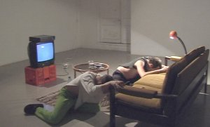 ברמבו של ירון אתר וישי גרוס, אנו פוגשים שני צעירים ישובים על ספה וצופים יחד בסרט רמבו. באחד מרגעי השיא של הסרט, כאשר סילבסטר סטאלון שולף כדור מגופו השרירי, קמים שני הצופים ומחקים את פעולותיו בתנועות אוטומטיות חסרות הבעה. שני שחקני הכורסה מאמצים מודל של גבריות מוקצנת ומוגזמת כמודל הזדהות, שאותו הם מחקים במעין טקס התבגרות מגוחך ואבסורדי בסלון הביתי.